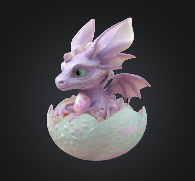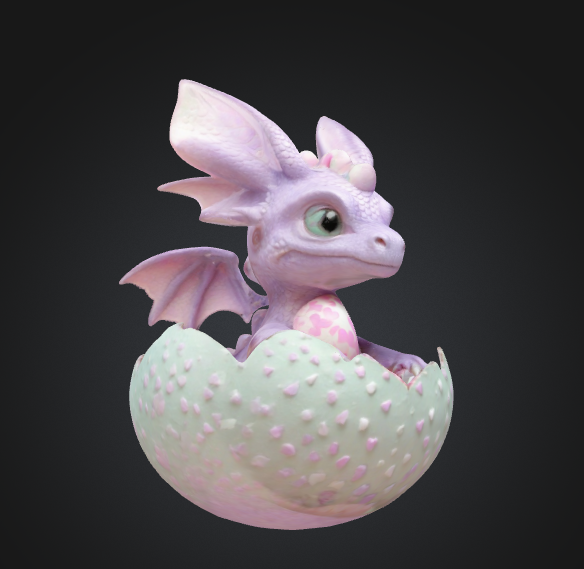 A charming lavender dragon hatchling emerging from a speckled pastel eggshell. The tiny creature features soft pink-hued scales, delicate wing membranes, and curious green eyes that suggest both innocence and ancient wisdom. Its small body sits partially within the decorative egg, which features pearl-like textures and complements the dragon's coloration. The combination of cute features and magical aesthetic creates an irresistibly whimsical figurine.