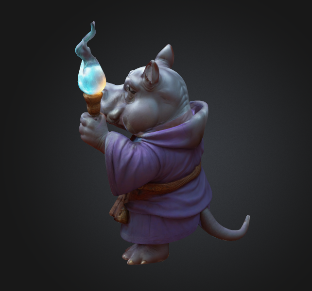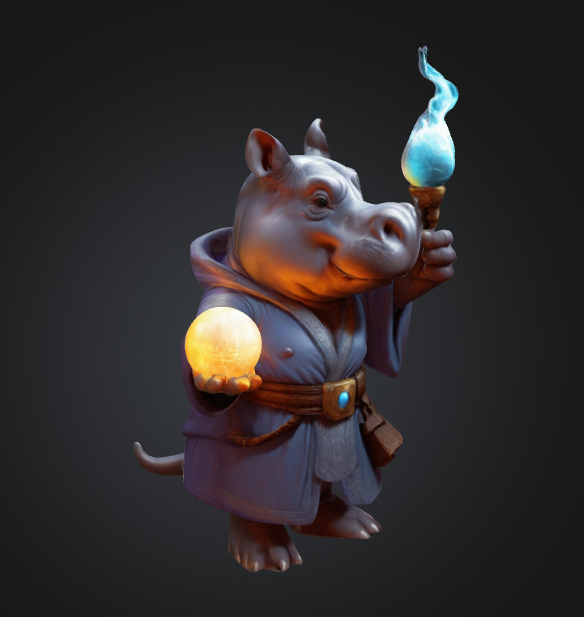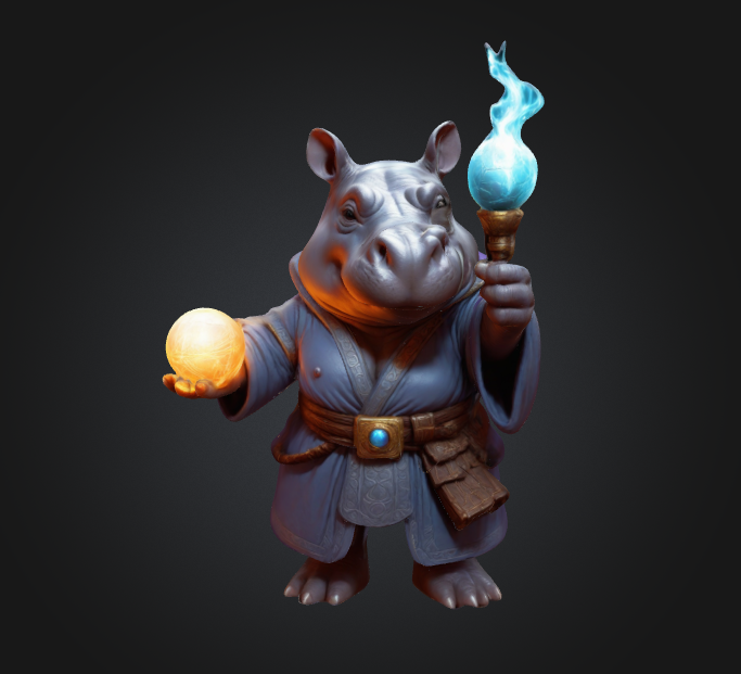 A dignified hippo magician wearing an elegant gray-blue robe with orange accents, complete with a belted pouch for magical components. In one hand, he holds a glowing blue flame staff, while the other cradles a shimmering golden orb of magical energy. His thoughtful expression and confident stance suggest both wisdom and power, creating a perfect blend of whimsical animal character and serious arcane practitioner.