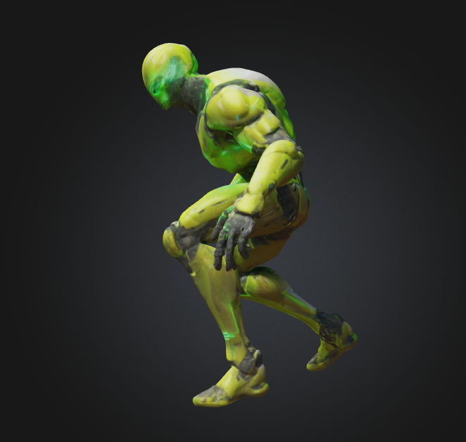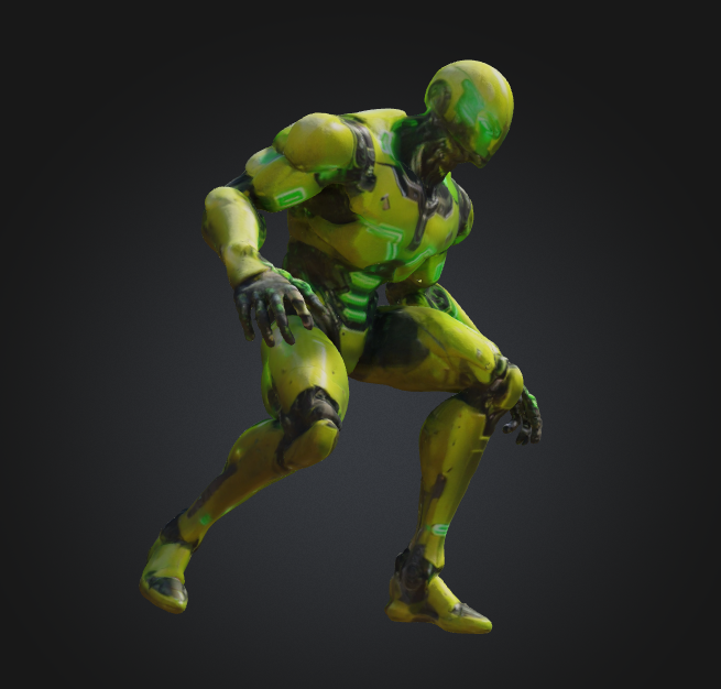 A sleek humanoid android with vibrant green and yellow body armor that resembles an advanced hazardous environment suit. Its streamlined design features visible mechanical joints and protective plating with subtle technological details. The featureless face maintains an enigmatic quality, while the athletic crouching stance suggests both combat readiness and exceptional agility. Black accents and metallic components enhance the high-tech aesthetic.