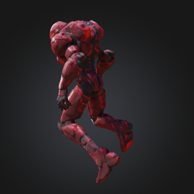 A formidable humanoid combat robot featuring sleek crimson armor plating with subtle black accents and glowing blue power nodes. Its streamlined design emphasizes function over form, with visible mechanical joints engineered for optimal battlefield performance. The featureless helmet provides an intimidating presence, while the athletic stance suggests both strength and agility. The weathered finish on the armor indicates extensive field experience.