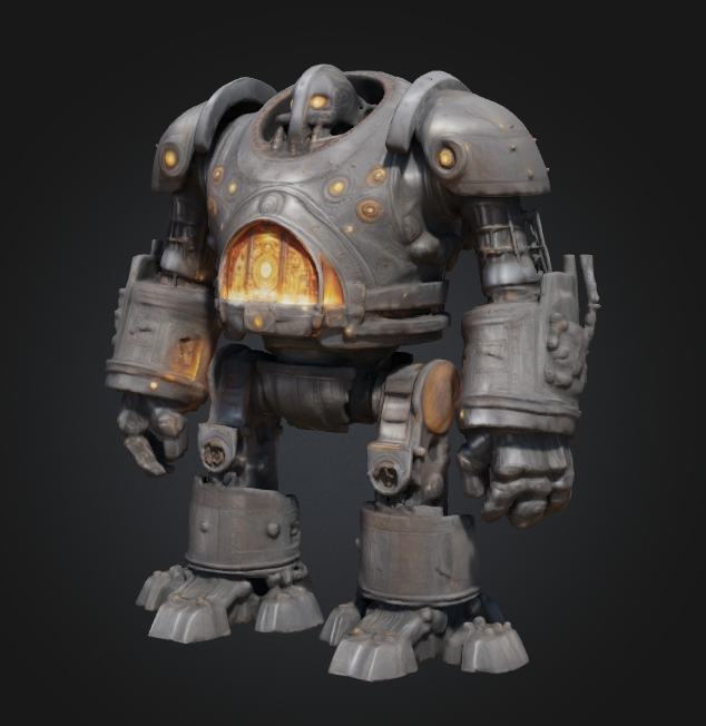 A massive industrial robot with a bulky gray metal frame highlighted by glowing orange and yellow power sources. Its sturdy design features a central reactor chamber that pulses with molten energy behind protective glass, while its broad shoulders and chunky limbs suggest tremendous strength. Multiple indicator lights dot its body, and its small head is recessed into a protective cowl, giving it a distinctive silhouette that balances function with an almost charming stoicism.