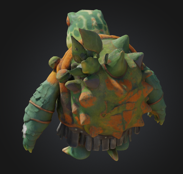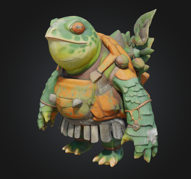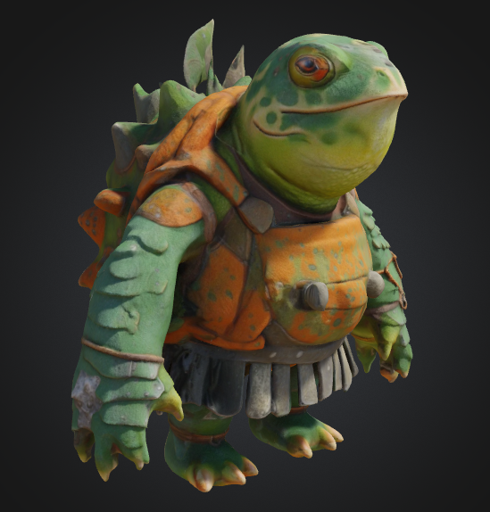 Toadmarsh is a stout, moss-colored toadfolk clad in swamp-forged armor splattered with camo-green and rust-orange. His body is sturdy and his gaze calm, but don’t mistake his mellow demeanor for weakness. A leaf-wrapped scroll and herbal pouch on his back hint at his connection to the ancient magics of the marshlands. His scale-like skin and webbed fingers mark him as a creature perfectly adapted to both land and water warfare.