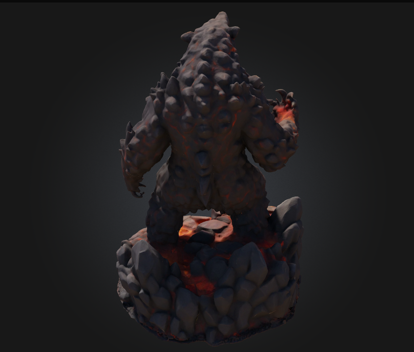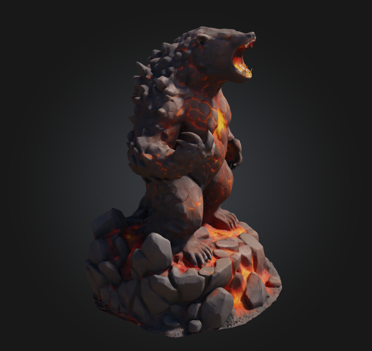 A fearsome stone titan emerging from molten rock, its body cracked with flowing lava veins. Standing in an aggressive pose with razor-sharp claws and a roaring expression, this creature embodies raw volcanic power. Its muscular form combines the strength of stone with the fierce energy of magma, creating an imposing figure atop a base of glowing volcanic rocks.
