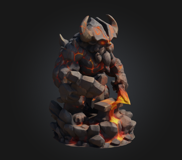 Grimheart the Eternal Smith was once the greatest forge master of the mountain kingdoms. When dragon fire threatened to destroy his people's ancestral halls, he made a pact with the mountain's molten core. The bargain transformed him into a being of stone and magma, granting him the power to forge legendary weapons but binding him forever to his forge. Now he stands as both guardian and craftsman, continuing his work through the ages. The magma flowing through his form serves as both his lifeblood and his forge fire, allowing him to create weapons of unparalleled power. Adventurers who prove worthy may find him still at work, crafting artifacts of incredible might. It's said that the weapons he forges carry not just enchantments, but fragments of the mountain's ancient power itself. Those who seek him must bring rare metals and prove their worth through trials of courage and wisdom, for Grimheart forges weapons only for those who would use them to protect, never to destroy.
