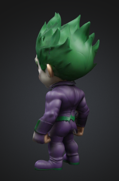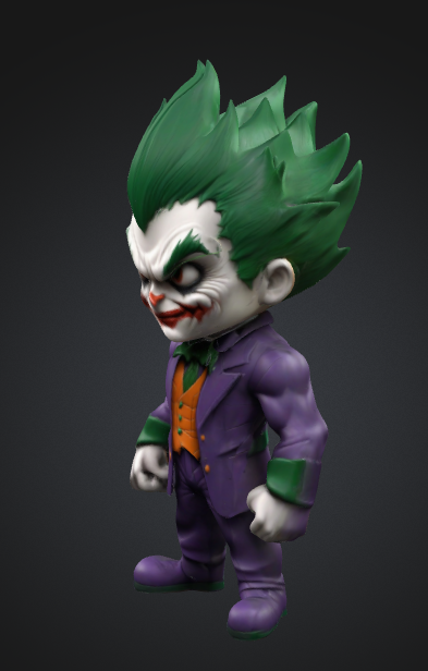 A diminutive version of the infamous Joker, featuring an oversized head with spiky green hair and an exaggerated menacing grin. His purple suit and orange vest maintain the character's iconic style while the super-deformed proportions create an oddly endearing appearance. The combination of cute design elements with villainous features creates a uniquely charming yet mischievous aesthetic.